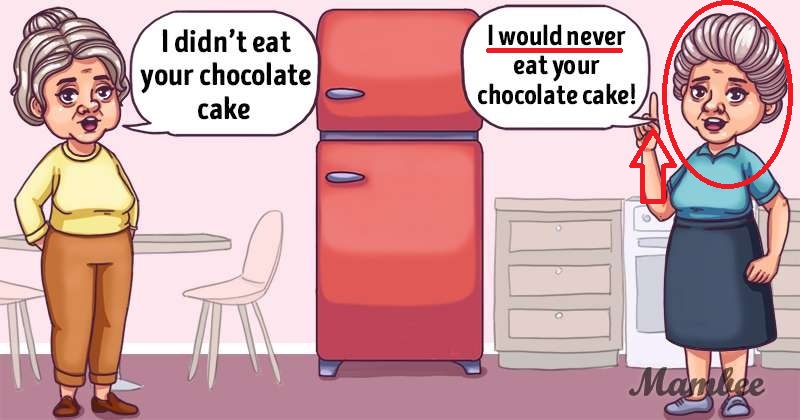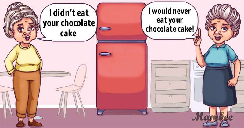 With all that being said, here is the answer to the puzzle. It is definitely more likely that the woman on the right is lying. She is defensively pointing her index finger while insisting she would ‘never’ eat the cake.