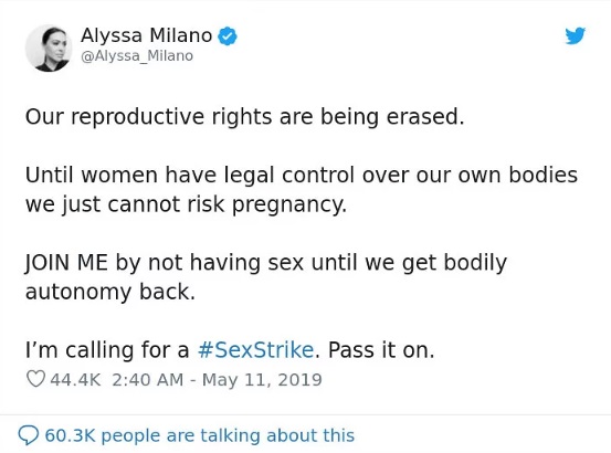 One of the activists is actress Alyssa Milano who started the “sex strike” and encouraged women to follow her example.