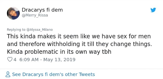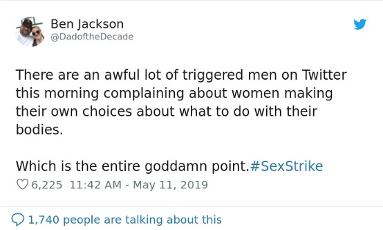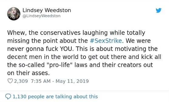 “Until women have legal control over our own bodies we just cannot risk pregnancy. JOIN ME by not having sex until we get bodily autonomy back. I’m calling for a #SexStrike. Pass it on.”