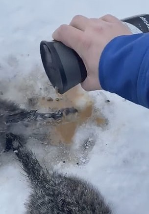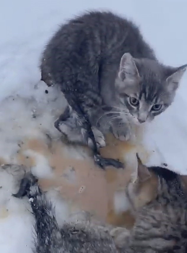 In a sweet moment, an oil worker sacrificed his warm coffee to free the kittens from the ice after their tails got frozen to the ground.