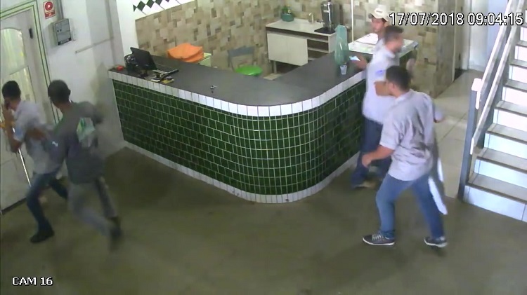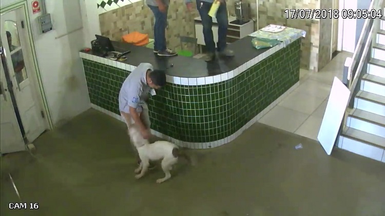 The workers immediately scramble away with three of them taking refuge behind the counter while the rest flee to a room and close the door while anxiously looking out the window built into the door. A few seconds later, a pit bull can be seen strolling in while furiously wagging its tail.