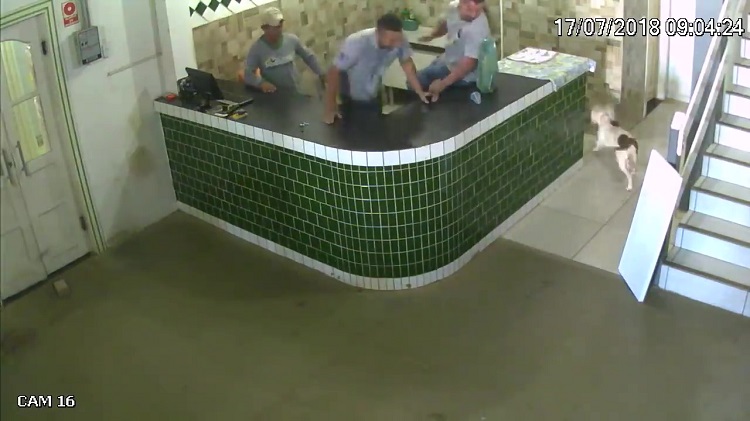 Which is probably why a group of construction workers in Rodnia, Brazil fled in terror when they saw a pitbull waltz into the lobby of the building they were working in.