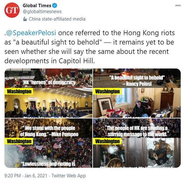 “@SpeakerPelosi once referred to the Hong Kong riots as ‘a beautiful sight to behold’ – It remains yet to be seen whether she will say the same about the recent developments in Capitol Hill,” the China state-affiliated media tweeted.