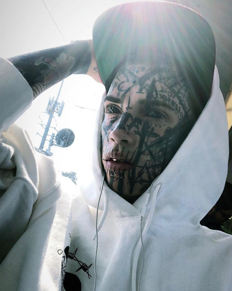 Roughly half of his face is marked with blank ink and his earlobes were also stretched pretty far. While some of the marks can be considered artistic, others seem to be simple shadings of parts of his body.