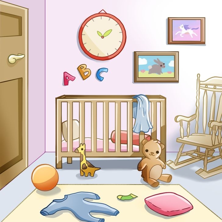 On the wall, you can see framed paintings, giant letters, and a big clock. On the floor, one can also notice a wooden crib, a rocking chair, and a bunch of clothes and toys.