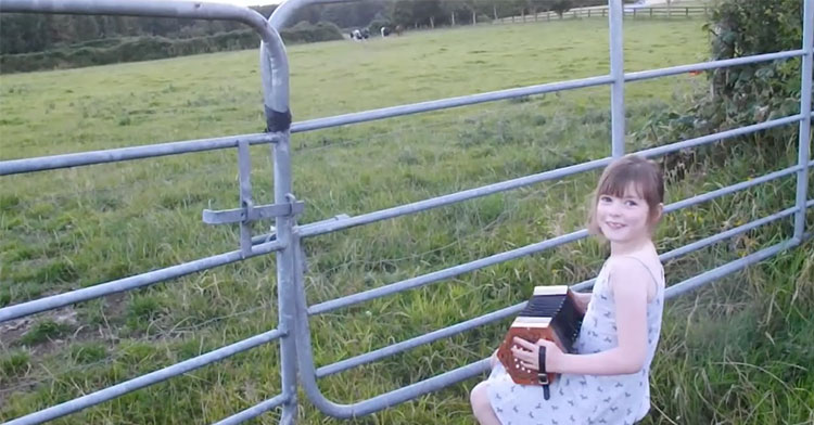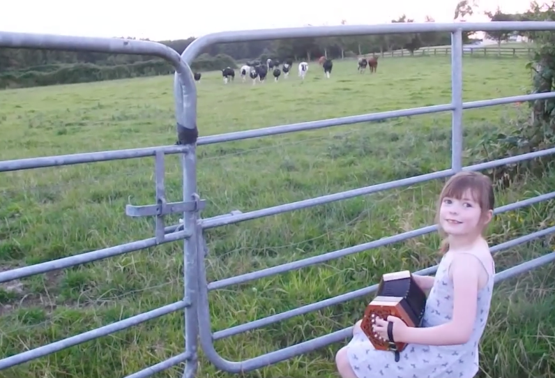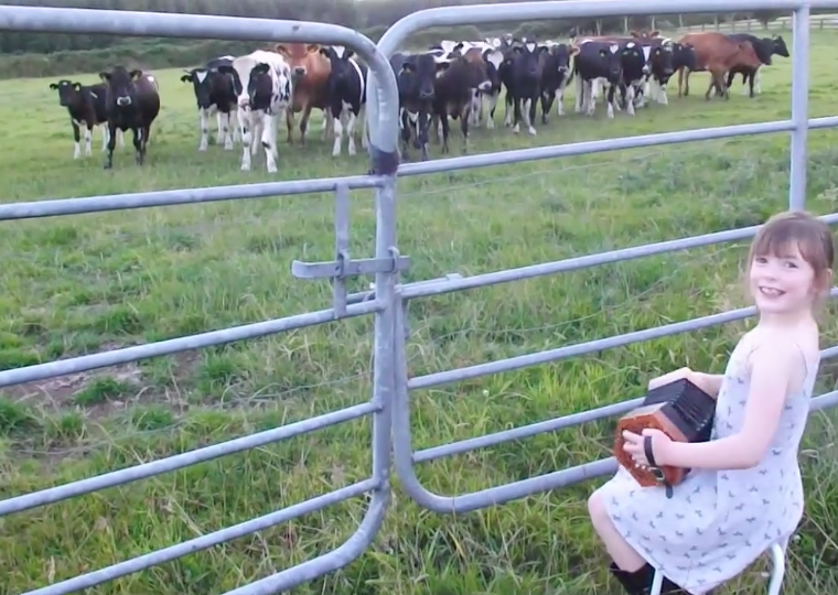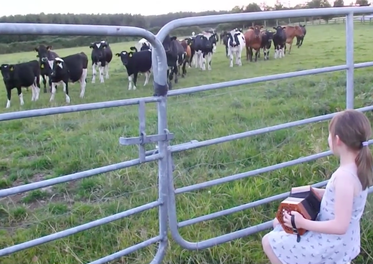 Watch this little girl playing accordion and cows come running to her!