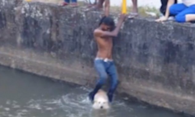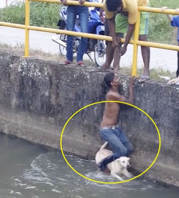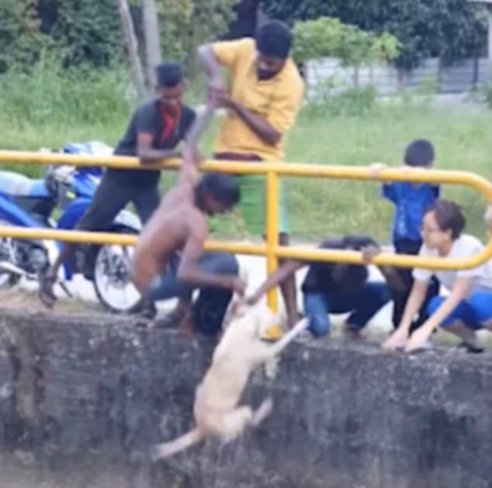 The canine was on the verge of drowning from exhaustion when suddenly a young man dangled himself from the safety barrier of the canal trying to get closer to the dog.