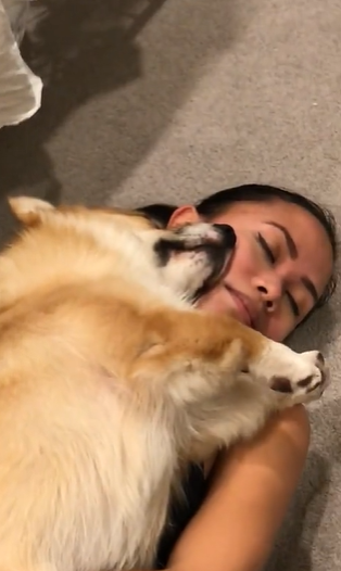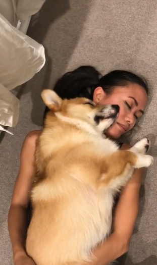 She wanted to spend time with her dog and wanted to do it just right. So she decided to cuddle and sleep with her baby.
