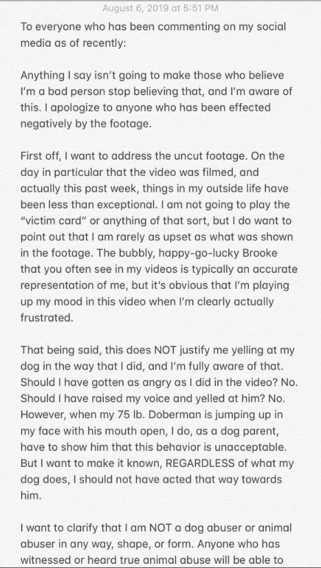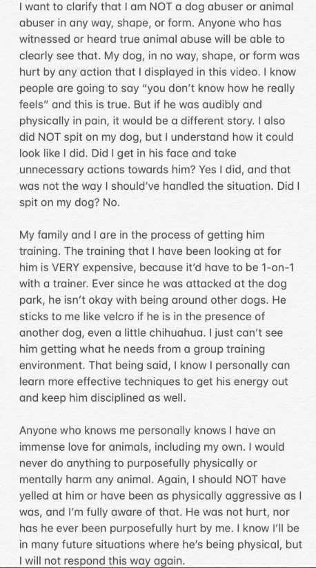 “I am NOT a dog abuser or animal abuser in any way, shape, or form,” she wrote. “Anyone who has witnessed or heard true animal abuse will be able to clearly see that.
