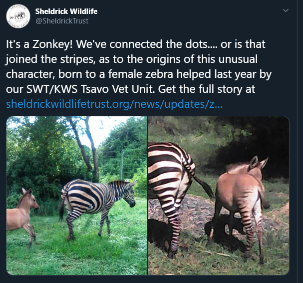 “The zonkey combines the sturdy body of its donkey sire and the striped legs of its zebra mother, which makes for a striking creature,” the wildlife trust explained.
