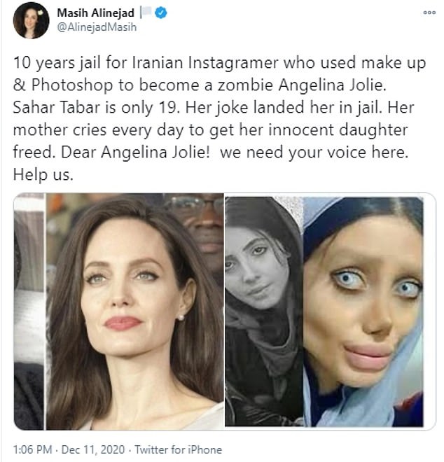 “10 years jail for Iranian Instagramer who used make up & Photoshop to become a zombie Angelina Jolie,” Alinejad wrote in her Twitter post.